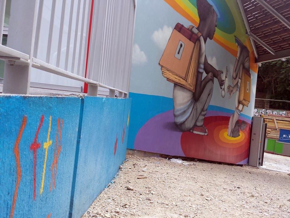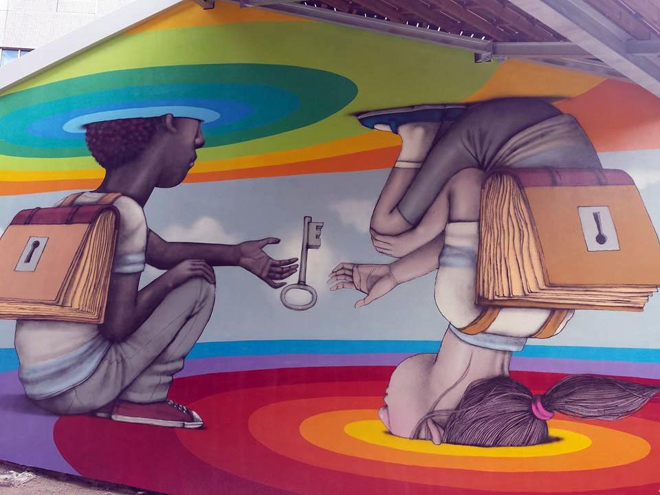 Known for his colourful and whimsical murals, the popular French street artist brought to life this signature piece showing a young boy and girl who appear to be sucked into colorful rainbow-like voids.