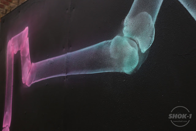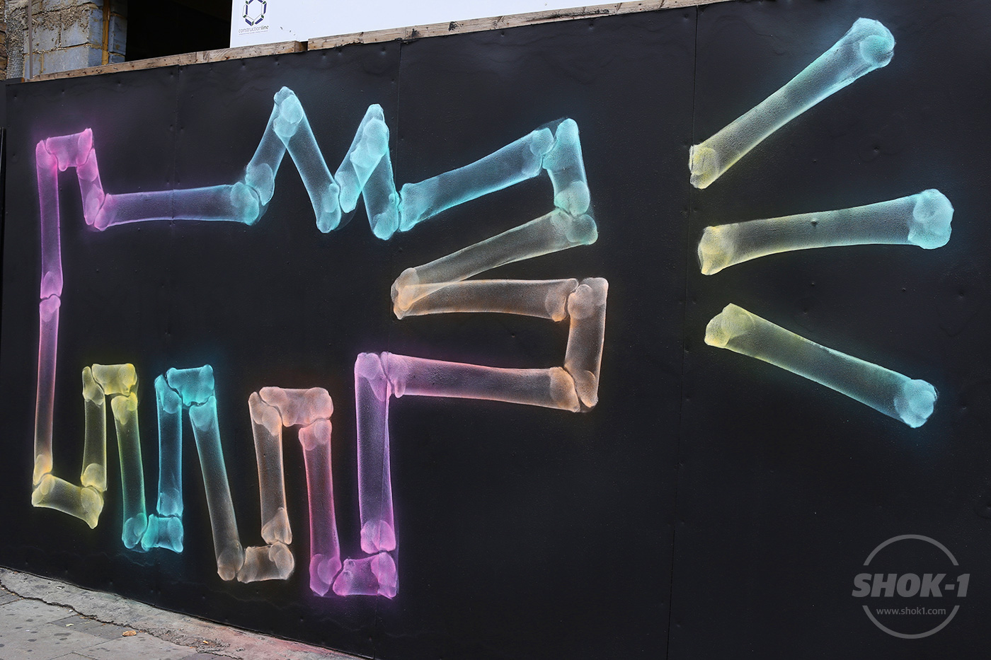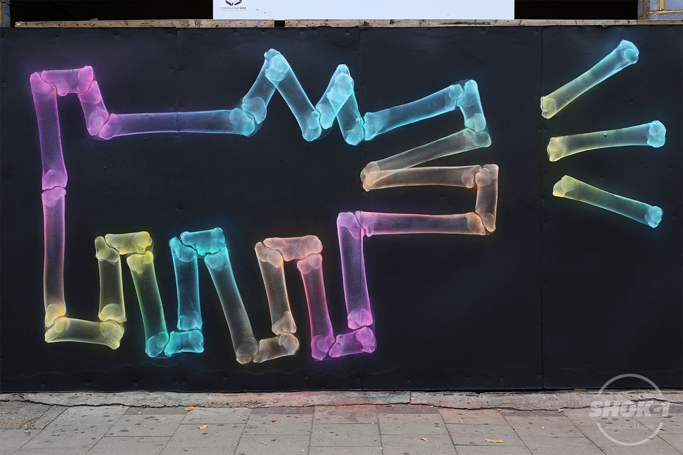 A reinterpretation of one of Keith Haring’s iconic dog paintings, the piece was spray painted in the heart of London in the artist’s unique X-ray style using a classic neon 80’s colour scheme. The piece is an unexpected and witty twist on an animal X-ray.