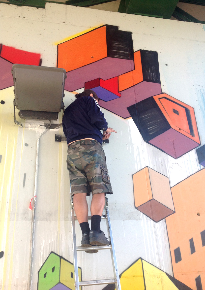 After a few days of work, the Italian artist created some of his signature imagery for the locals to enjoy. Floating geometric forms are creating large compositions and the scale helps define the forms as they intersect and climb upon each other.