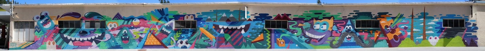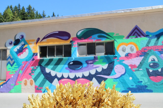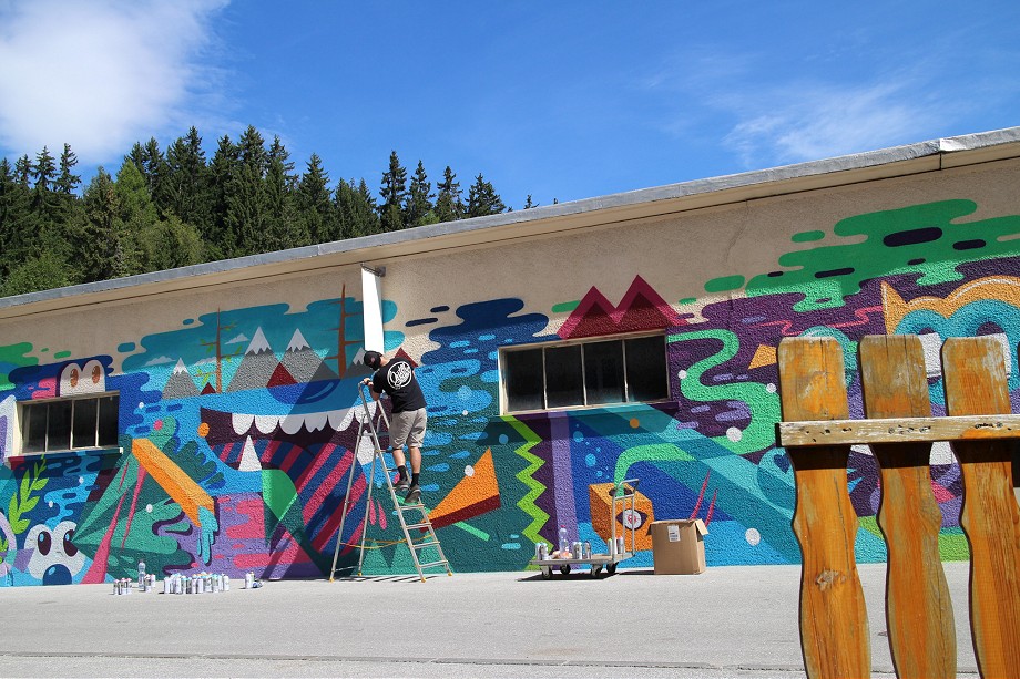 Greg Mike recently finished his longest work to date in Crans-Montana for Vision Art Festival. Working on a 40m long wall, American artist created an explosion of colorful, cartoon-like imagery.