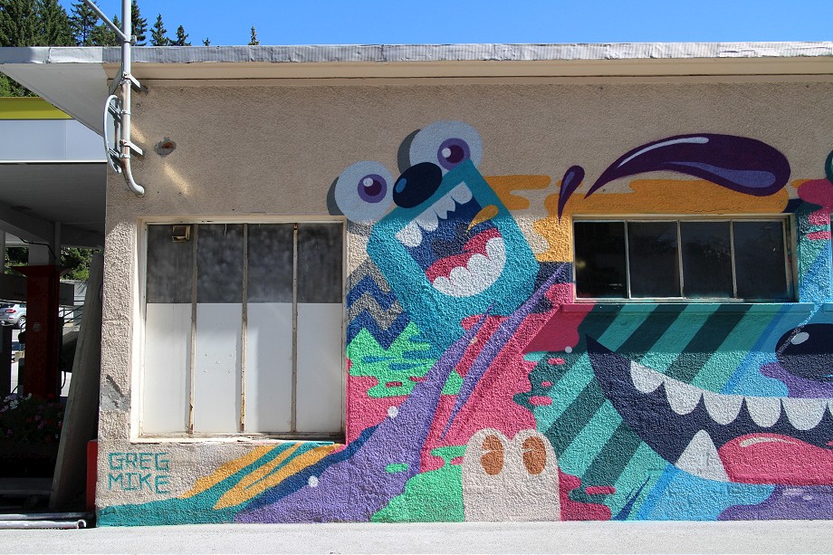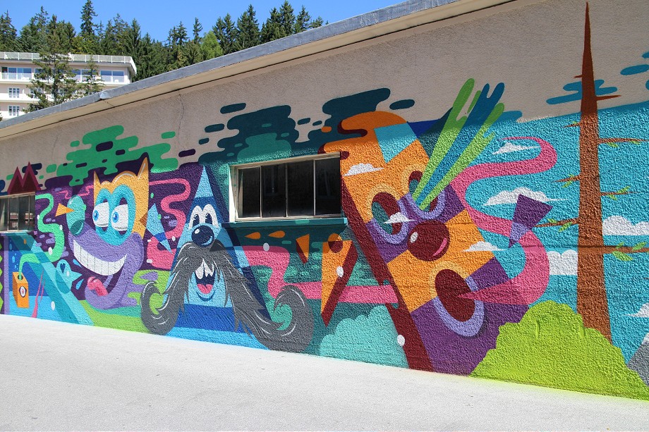 Incorporating some of his recurring characters and elements, Mike successfully presented his signature style in well known Swiss resort. Inspired by the scenery around him, his characters are surrounded with mountain peaks, pine trees, but also colorful and pattern rich shapes. Working only with spray cans, using bright colors, he filled the wall with big bulging eyes, wide open mouth, smiles, mustaches, creating a nice contrast against the traditional Swiss architecture around.