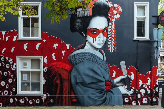 He teamed up with local artists and friends Nol Art and Edo Rath to work on a wall in Ginnekenmarkt, Breda. With a distinctively Japanese colour palette, the artists signature geisha work is given an alternative lease of life by the playful character backgrounds of the Dutch artists.