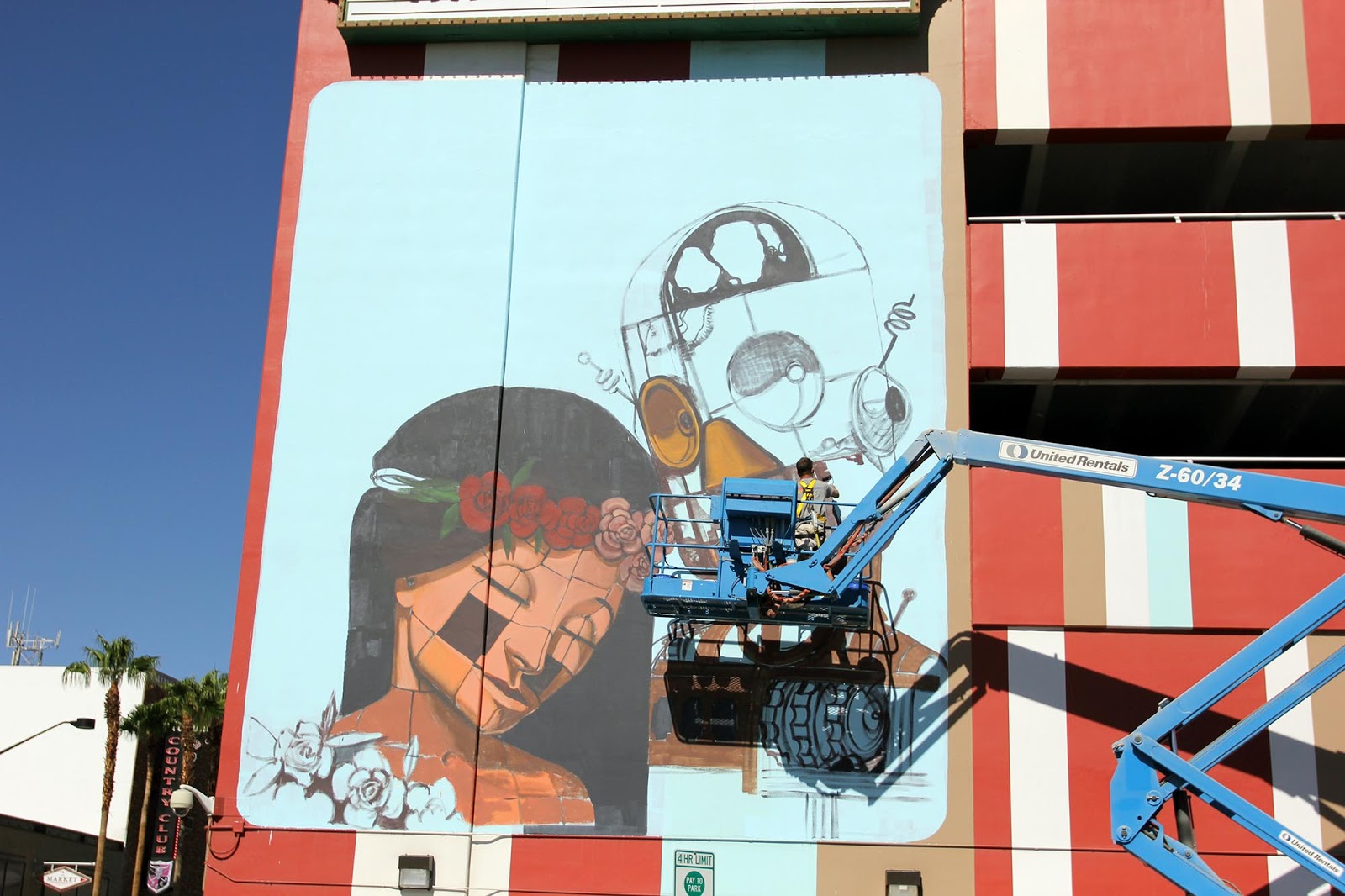 Our buddy, the Italian street artist Pixel Pancho is the first to start his piece in Downtown Las Vegas which should be completed by tomorrow. As usual, Pixel is going big with some of his signature robotic imagery!