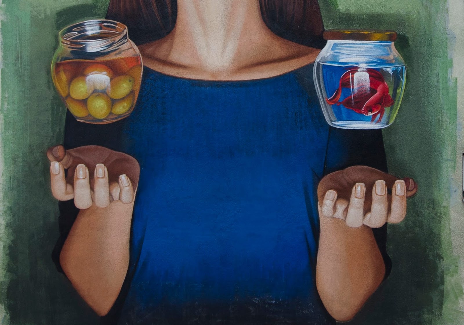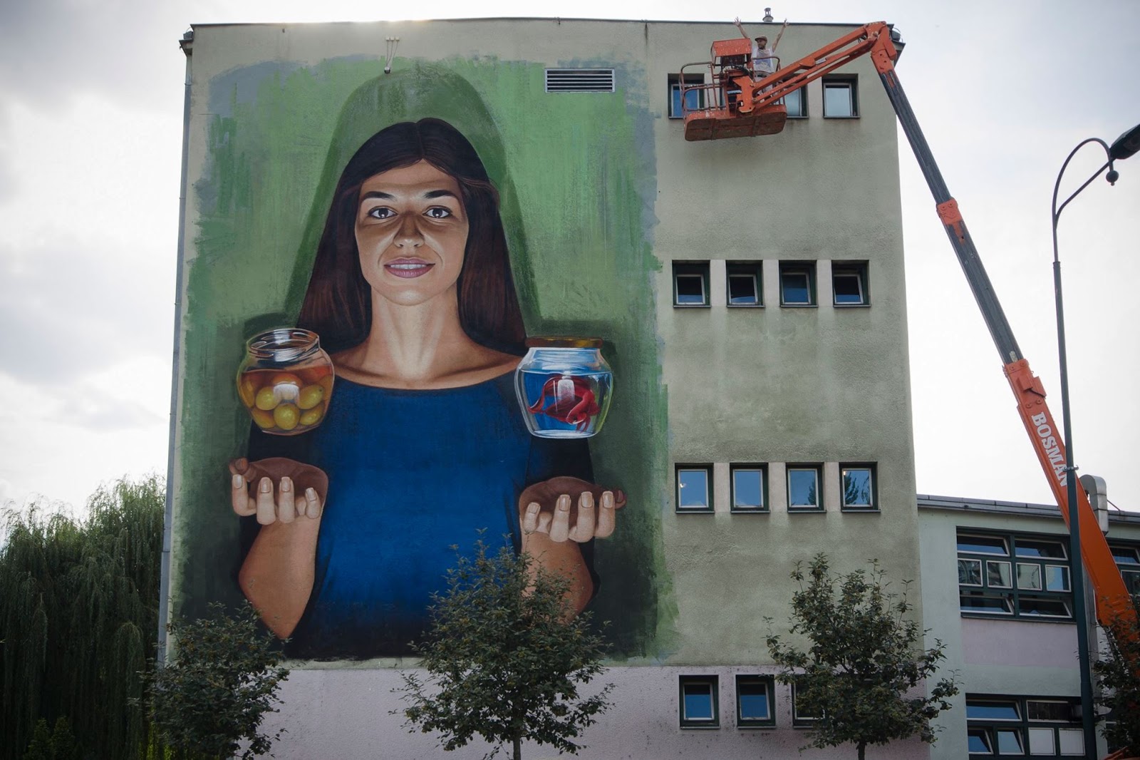 Titled “Allegory of Peace and War” the image is a clever metaphor of the eternal battle between good and evil in it’s most direct manifestation. Painted in a city that was torn apart during a war only 2 decades ago, the piece is depicting a female character balancing two jars, one with olives and one with a Siamese fighting fish, a recurring image in Lonac’s work. Known to be extremely aggressive to it’s kind, just like humans, the fish in a closed jar is symbolizing war, while the olives in the open jar are symbolizing piece. With his impeccable technique and skills, Zagreb-based artist quickly wrapped up this impressive photo realist piece, once again proving his huge talent.