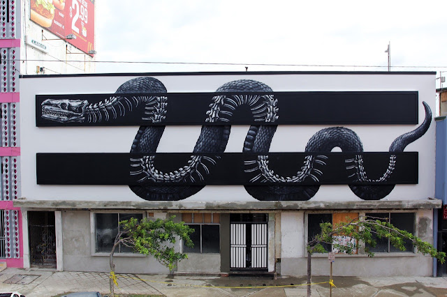 The Belgian street artist spent a few days working on this brand new mural on the streets of San Juan where he created this hybrid snake passing through some kind of X-Ray scanner. ROA will now be heading to Arkansas to work his magic in Fort Smith.