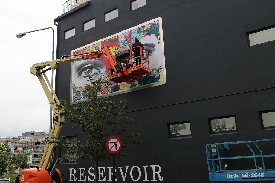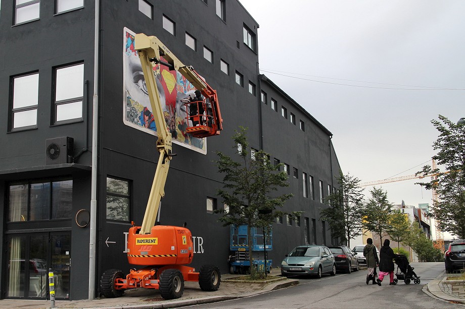 Sandra Chevrier is producing work that unites a feminine gaze with heroic expression, creating powerful and metaphorically androgynous art. Her colors are sharp, and her tools peculiar; Chevrier uses paint and actual comic book strips to produce mixed-media illustrations of women.This mural was painted as the first part of the Aftenblad Wall project that Nuart is doing with Stavanger Aftenblad newspaper. The idea of the project is to commission a new art piece every 3 months.