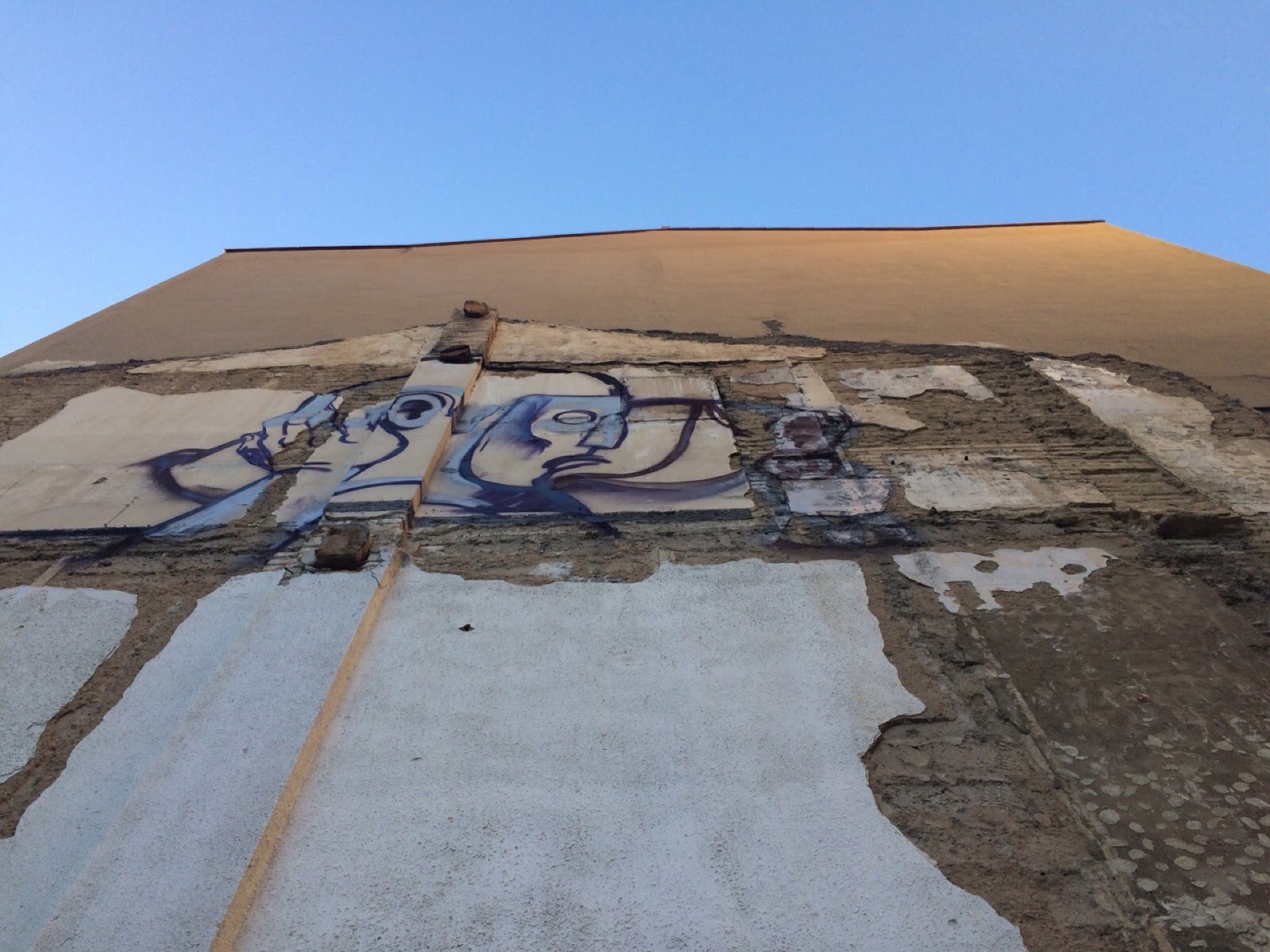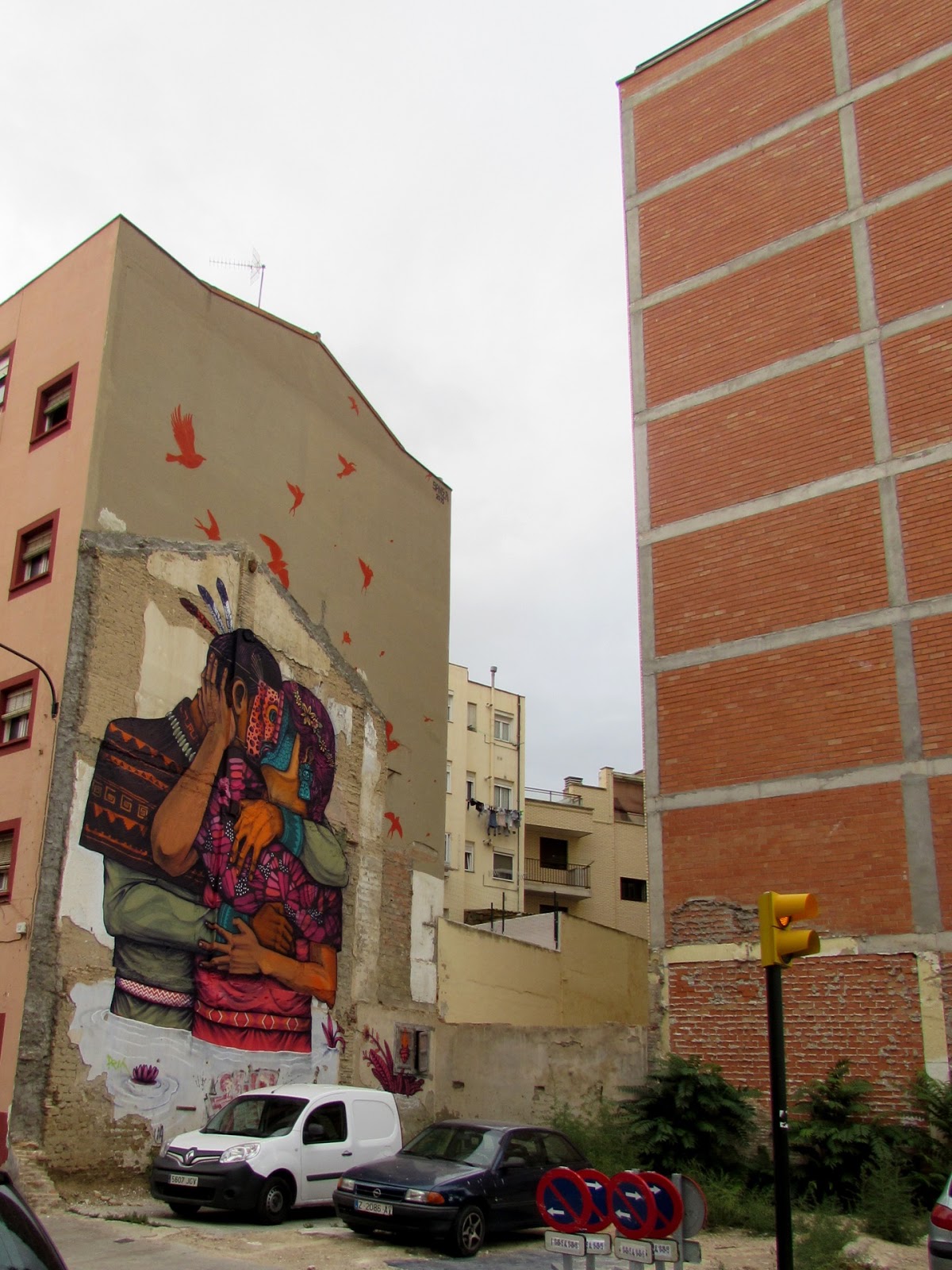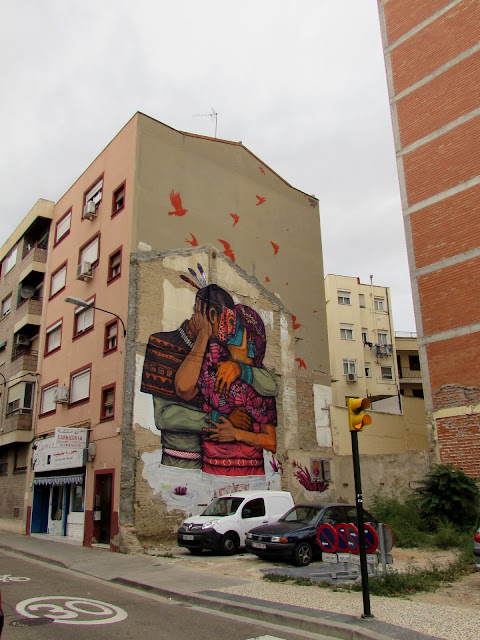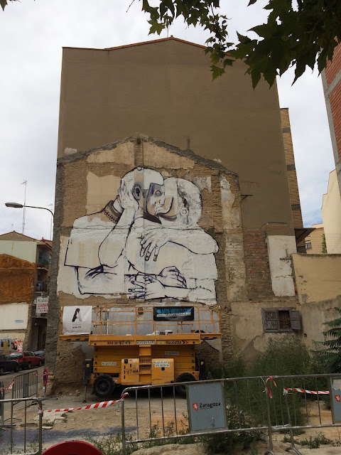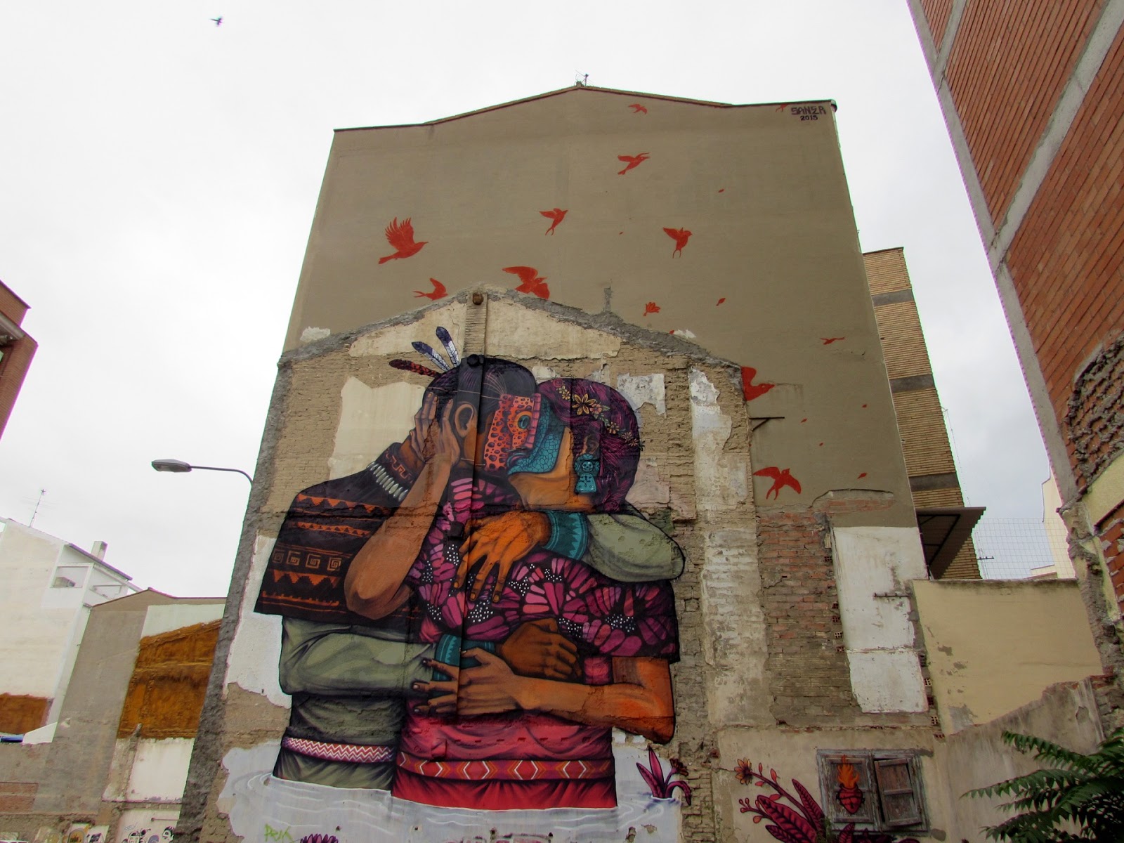 Painting on the streets of Zaragoza for the latest edition of the always excellent Asalto Festival, the Mexican muralist unveiled this beautiful piece showing a kissing couple wearing traditional Mexican masks and ponchos.