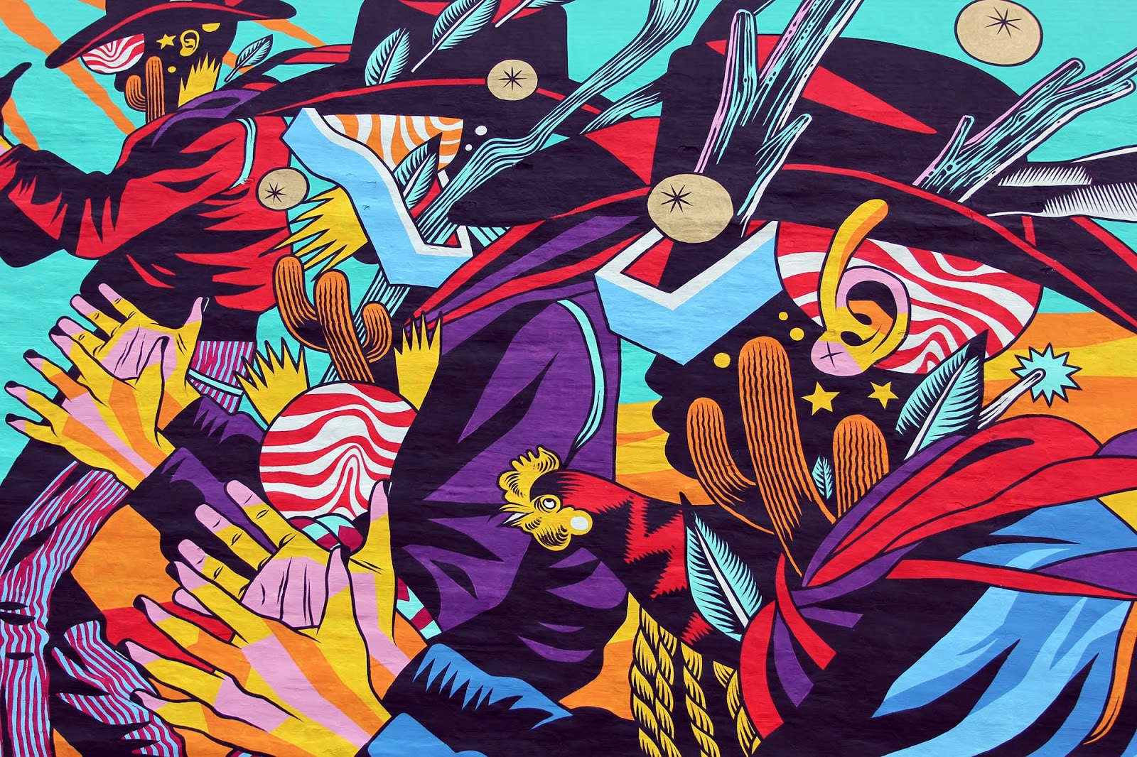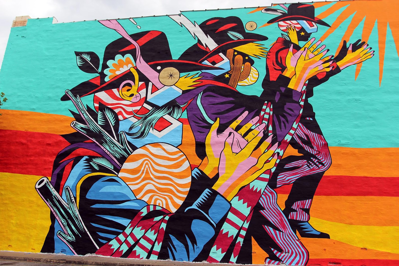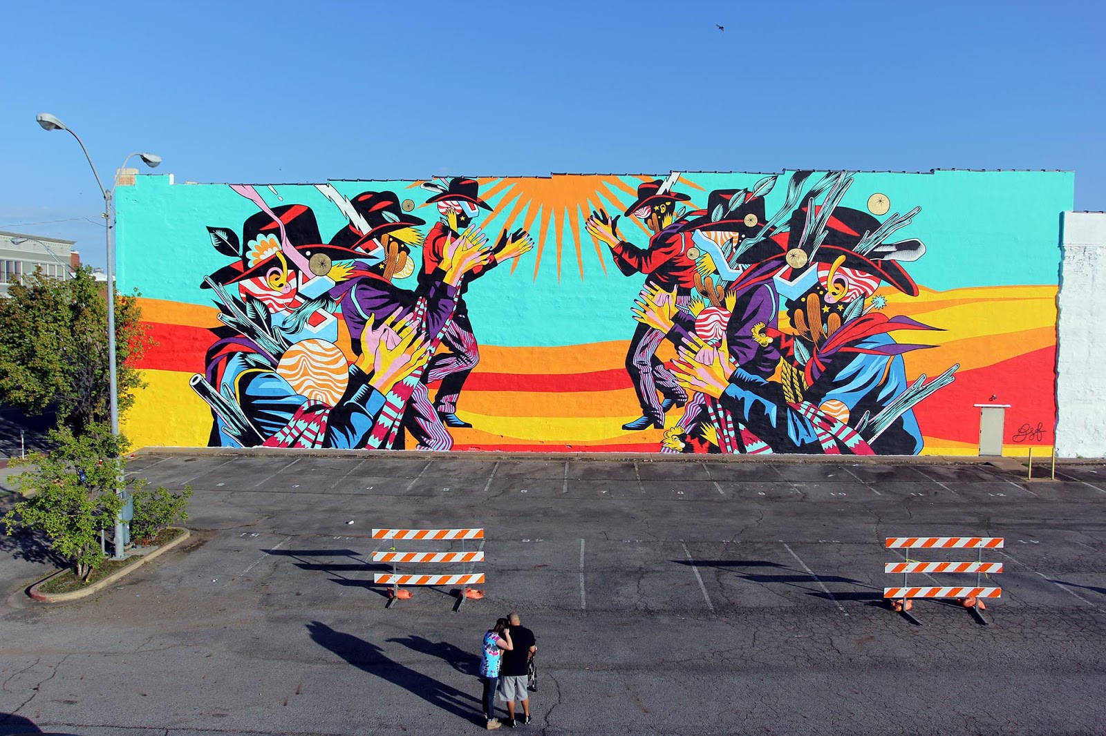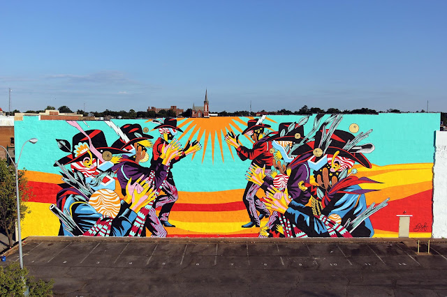 In town for the Unexpected Festival, curated by JustKids, the Brazilian duo spent over a week to create this beast of a wall. The Catira is a typical dance from the interior area of Brazil, where Bicicleta Sem Freio are from, and is performed by ranchers and farmers. This piece is their tribute to the town of Fort Smith, Arkansas. As usual with Bicicleta Sem Freio, the colors are popping and this will surely be enjoyed through the year by the local residents.