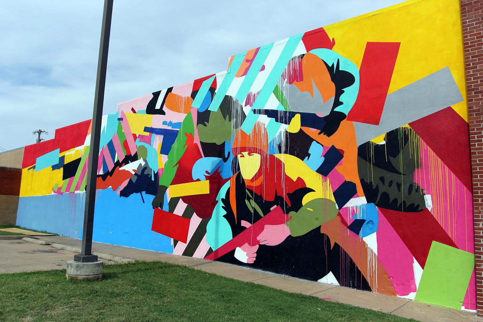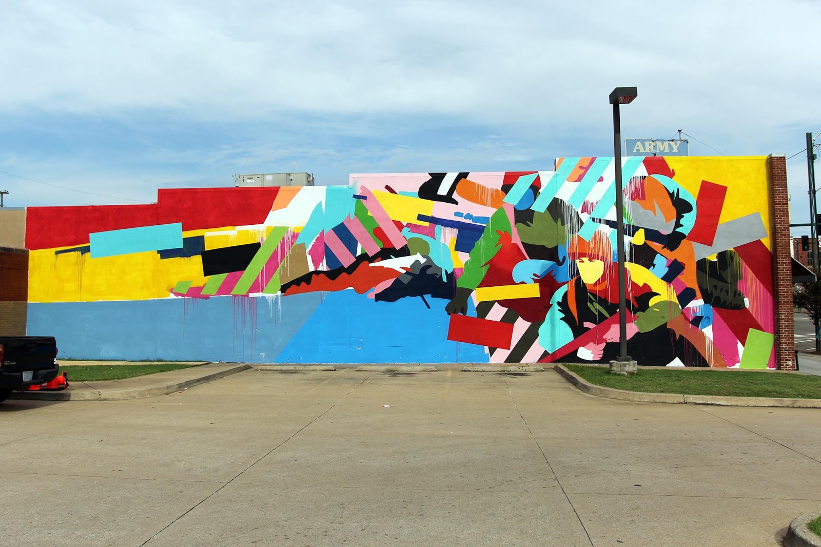Curated by JustKids, the talented Irish artist Maser was given the opportunity to create a new artwork on the busy Garrison Avenue. After a few days of hard work under the intense heat, Maser just wrapped up this lovely new piece which is featuring his signature geometric imagery combined with a series of colorful army soldiers.
