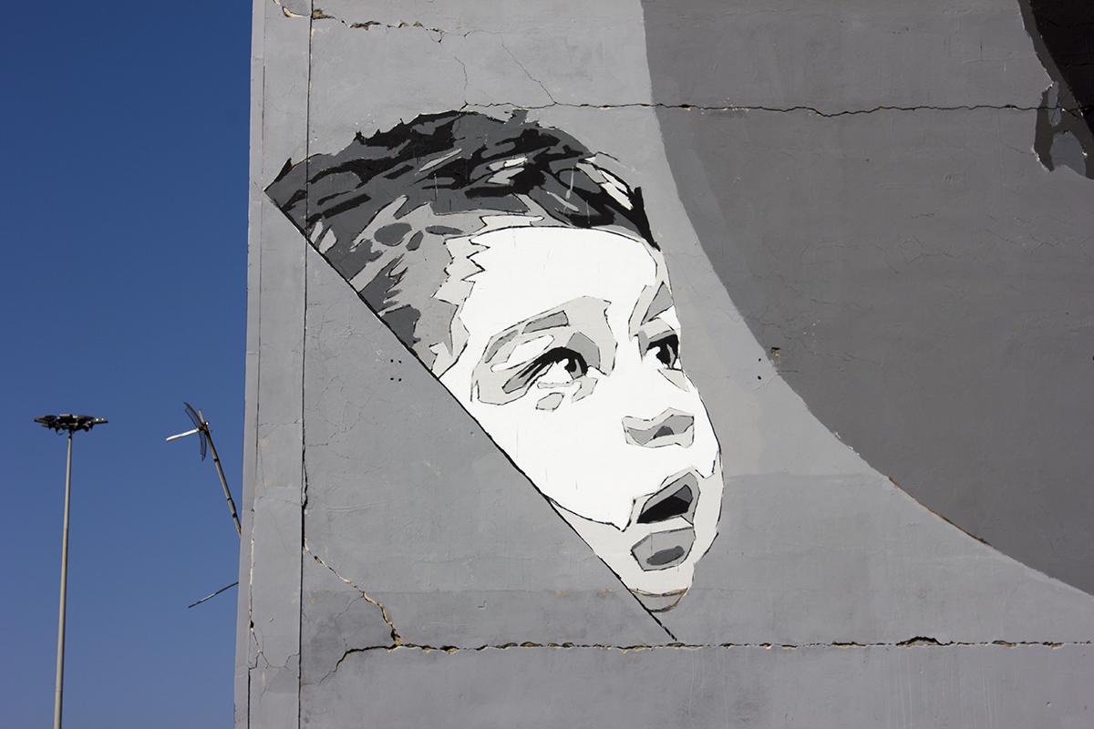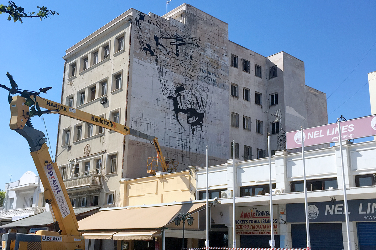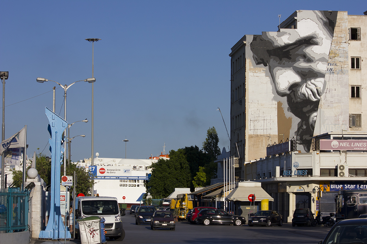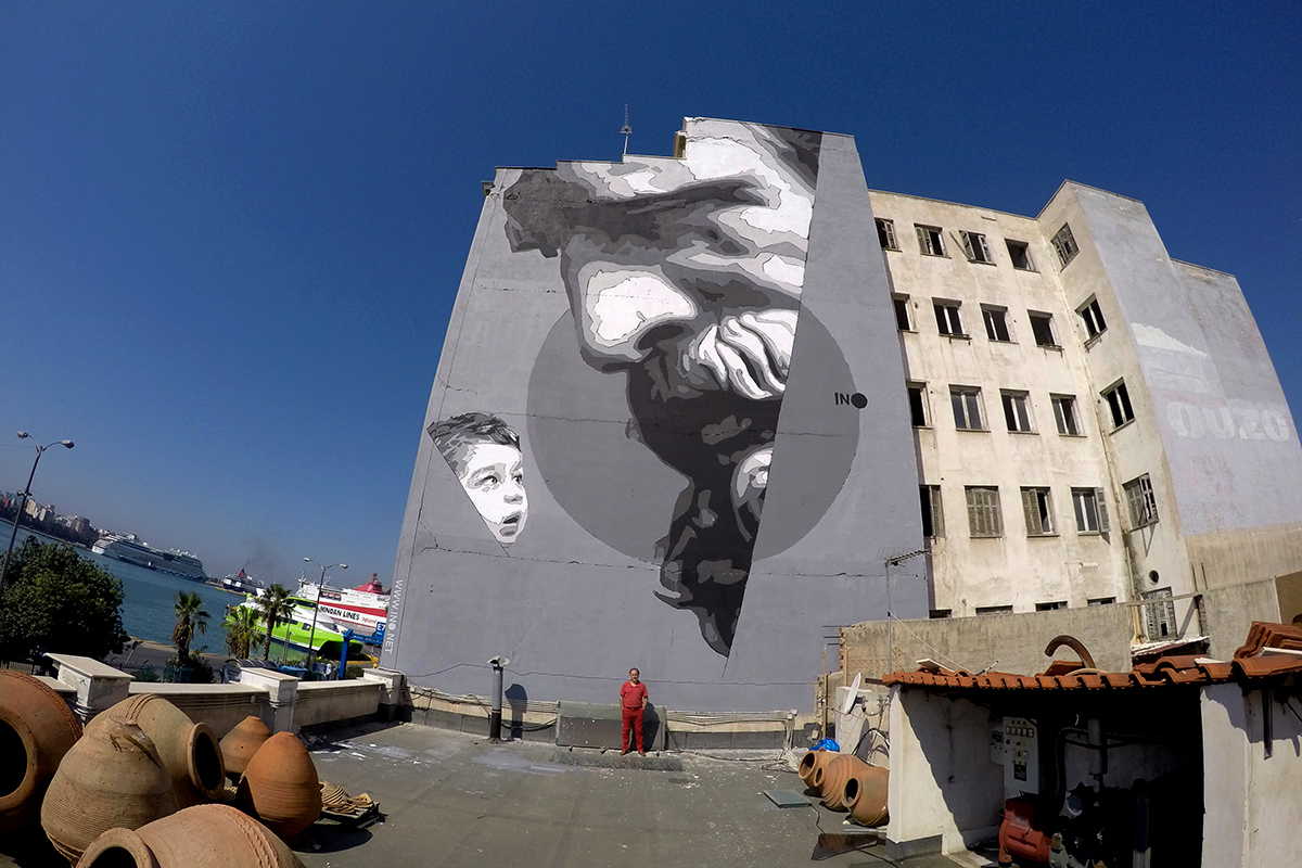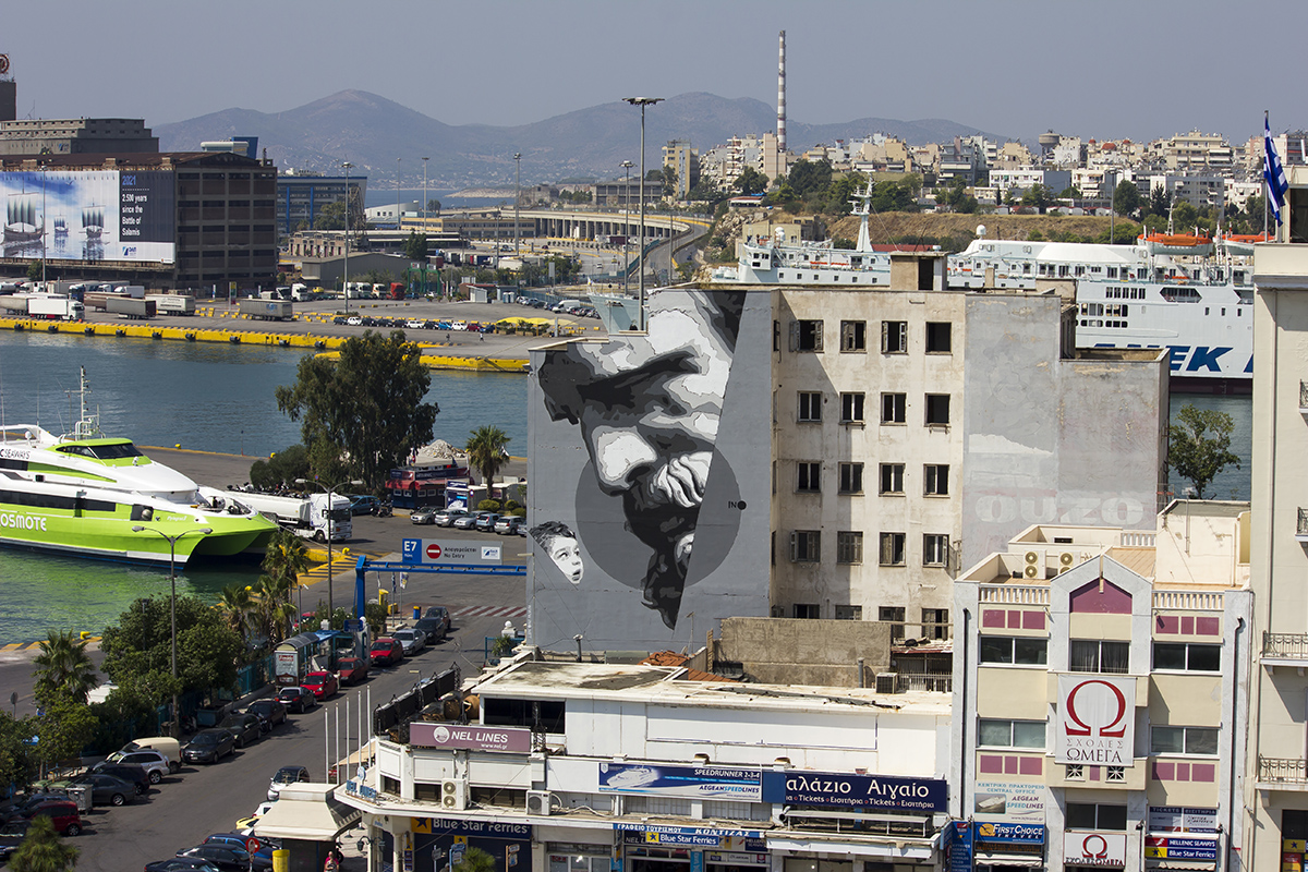 Greek visual artist iNO created this mural on the center of Piraeus Port, one of the largest seaports in the Mediteranean sea located in Greece. The artist was interviewed by the National Geographic staff and the mural creation proccedure was filmed for an upcoming documentary. The artwork is entitled “We Have The Power” and is depicting a child looking up at a huge portrait of the ancient philosopher Democritus. Knowledge is power.