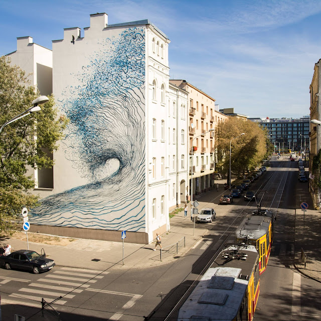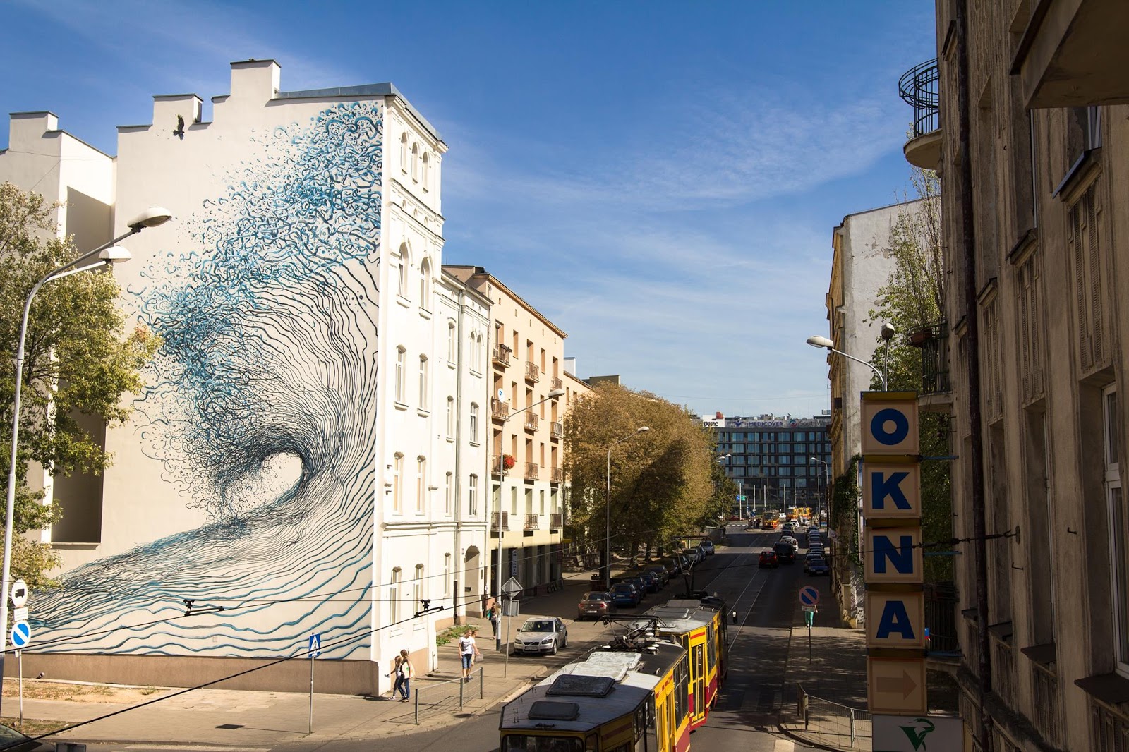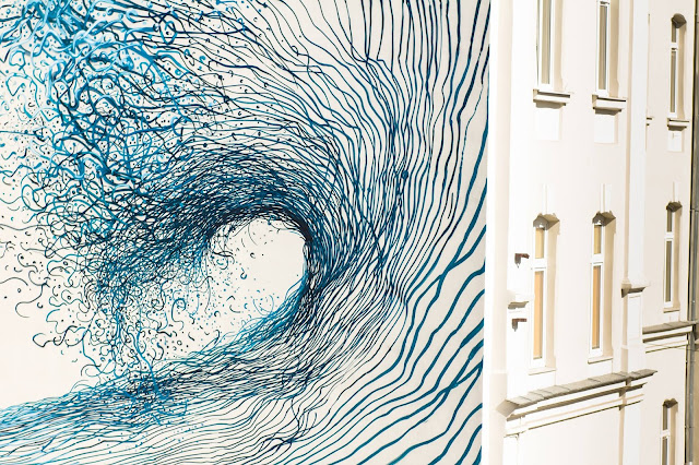 The globe-trotting Chinese street artist spent a few days up high on his cherry picker to create this energetic piece of work showing a huge wave painted using his signature and unique 3D technique.