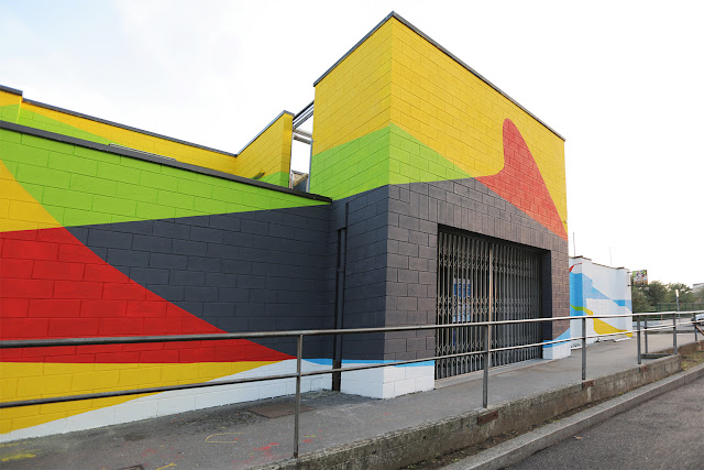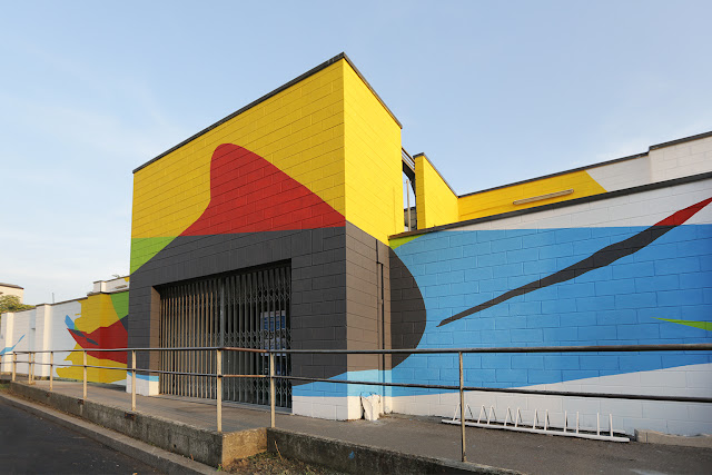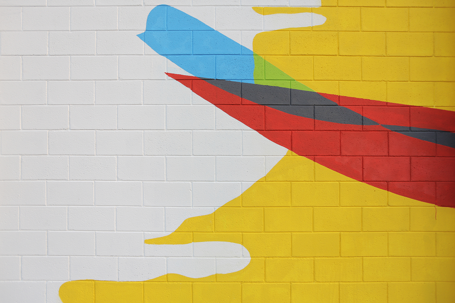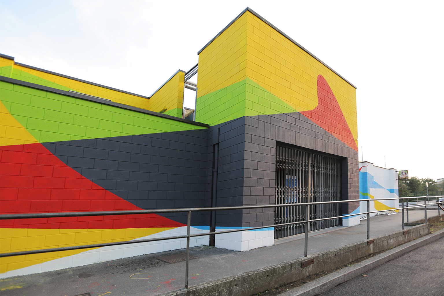This mural installation is based on the contrast between the rigidity of the Building and morphological elements of the work.