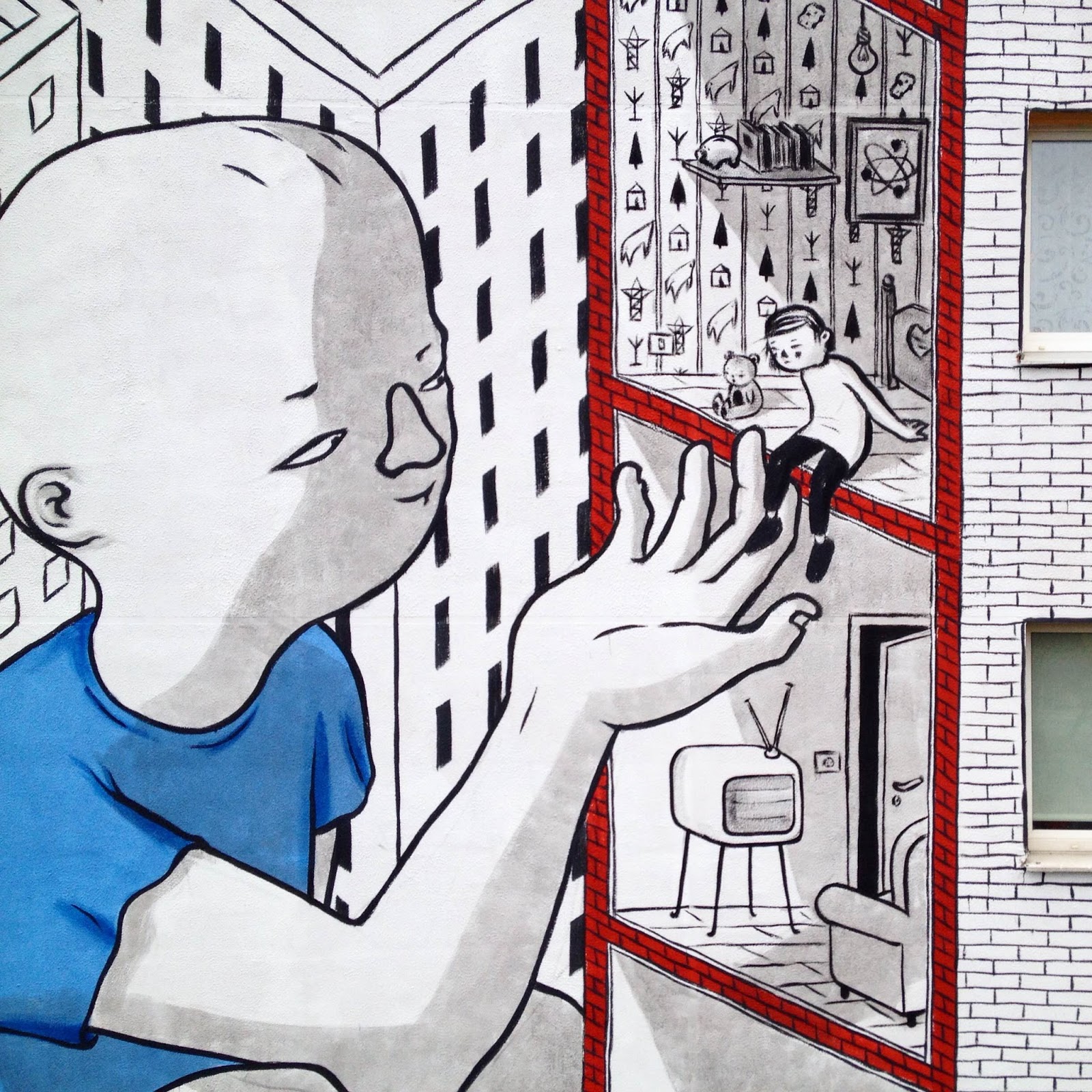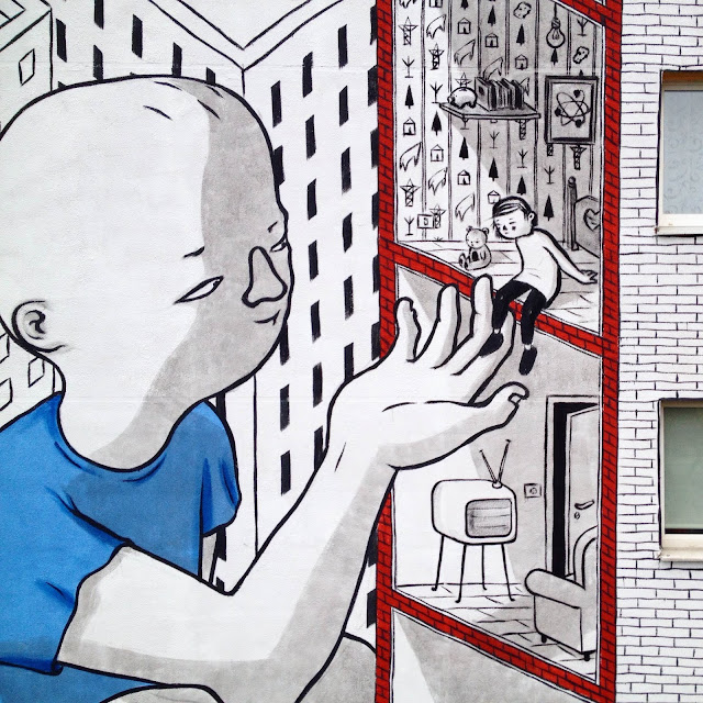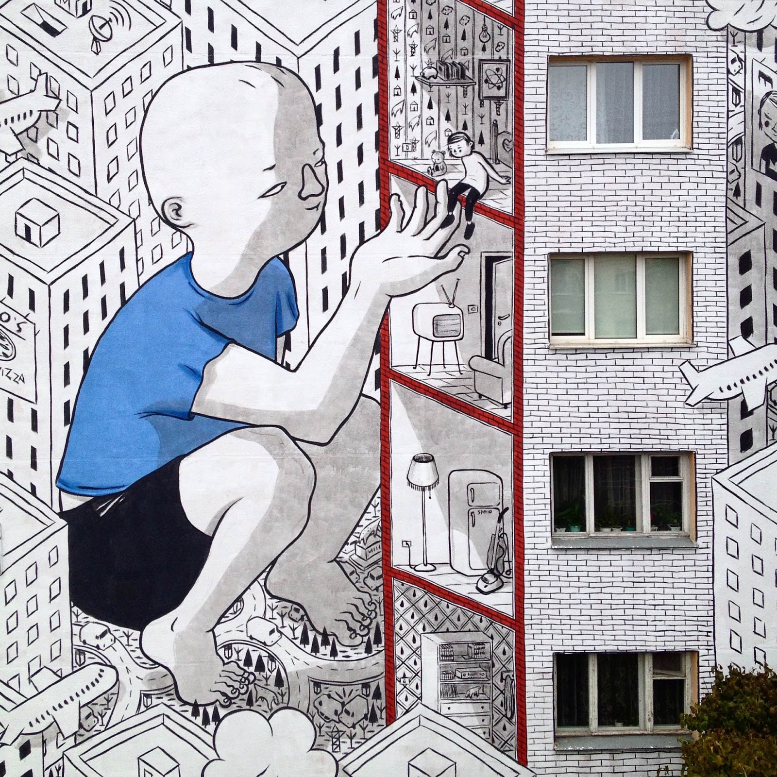 The prolific Italian artist created yet another signature piece of work with “Everywhere I Go” showing one of his oversized giant bald characters interacting in a city that is way too small for him. This time around, he found a smaller friend which will probably be following him everywhere he goes.