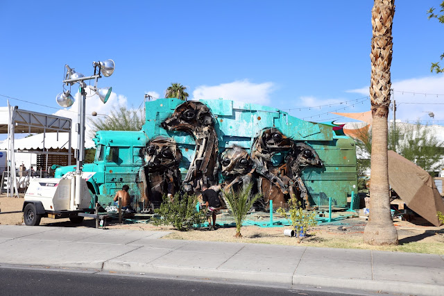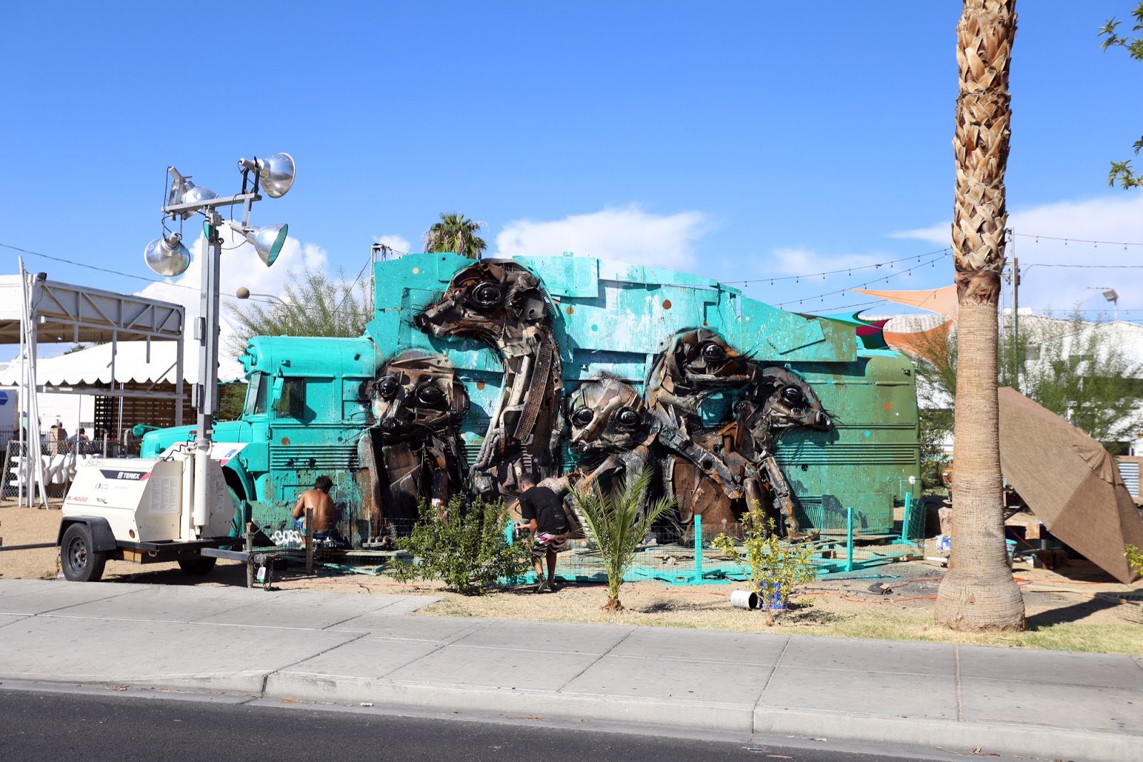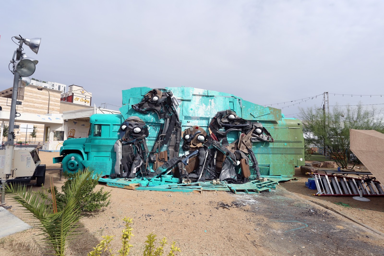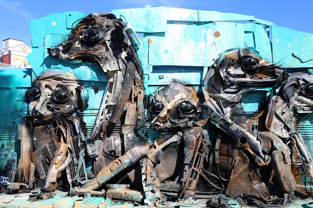 Geared with spray paint and a dumpster of trash, the Portuguese street artist created this unique installation showing a group of Meerkat chilling against a bus. Just like his previous works, this piece was entirely built using trash and found materials from Sin City.