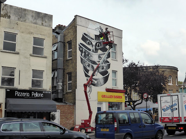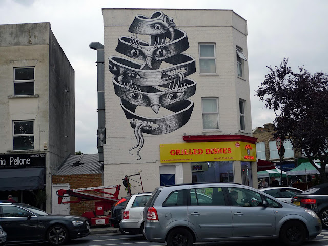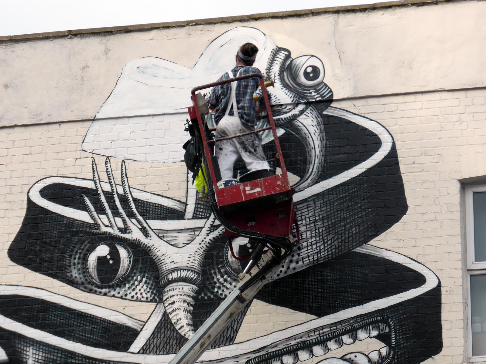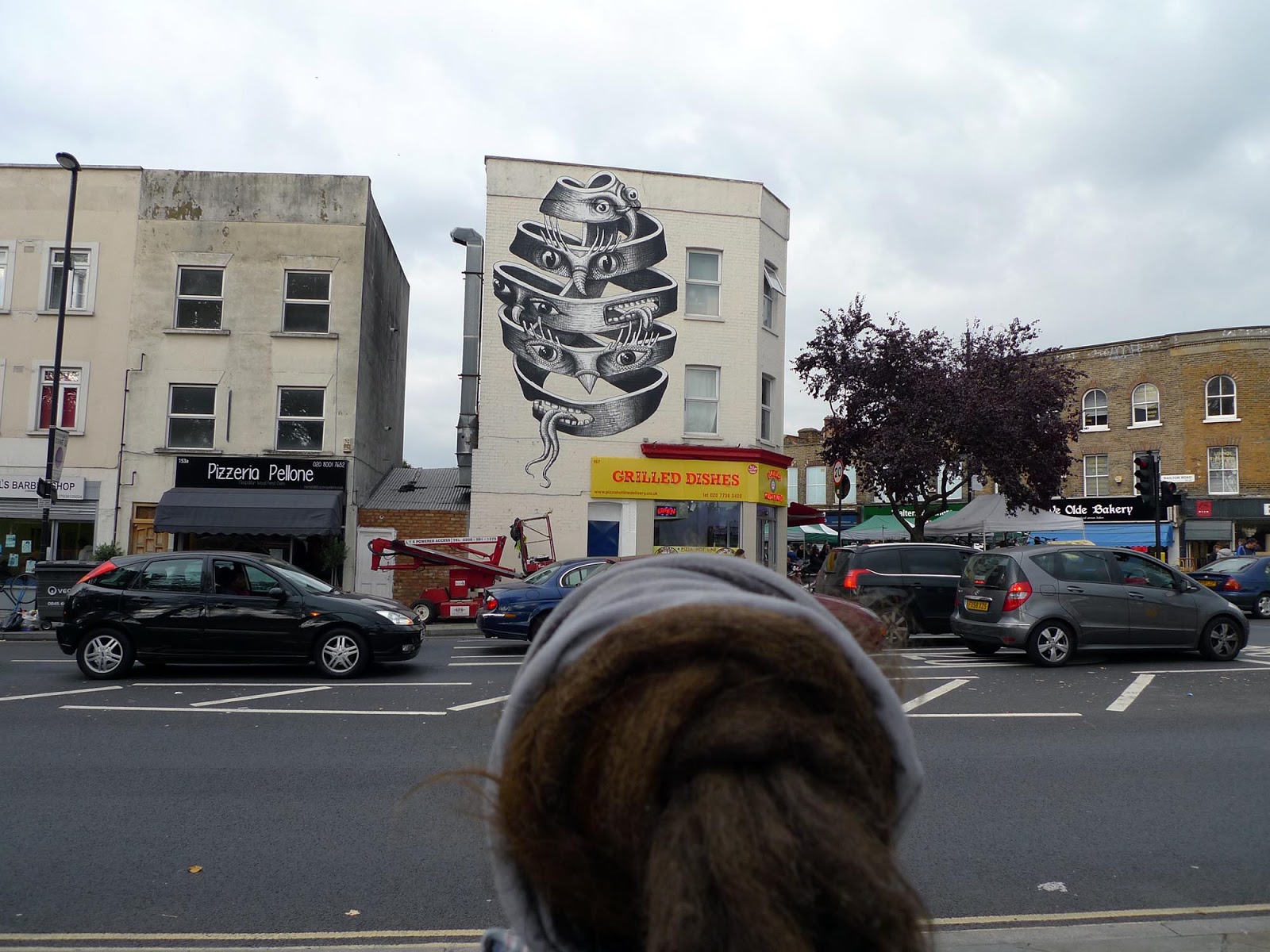 The British street artist created yet another stunning piece of work with this mural based on MC Escher piece “Bond Of Union”. For once Phlegm’s signature characters aren’t present in the design. The piece was made to coincide with the Escher exhibition currently taking place at the Dulwich picture gallery.