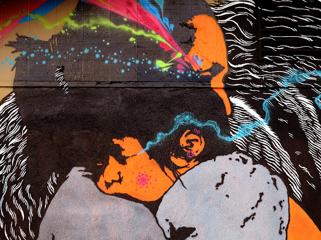 The newly formed trio quickly worked their way through this beautiful piece showing some of Stinkfish’s signature stenciled portraiture combined with a sleeping wolf. As usual, several colorful abstractions are found all over the artwork.