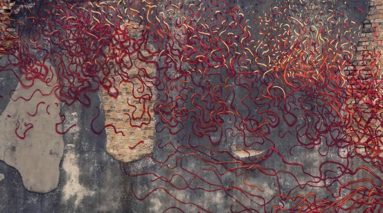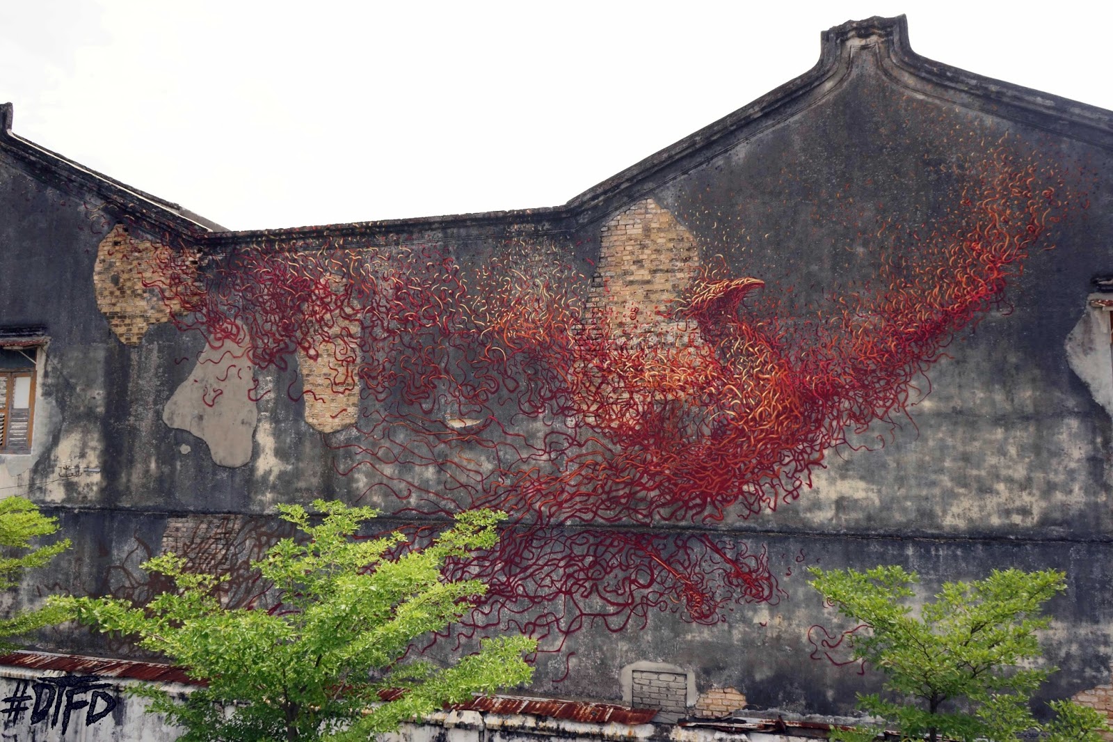 Working up high on his cherry picker, the Chinese artist spent a few days under the scorching heat to create a beautiful Phoenix painted using his signature 3D-wires technique. Branching away from Black and Grey, DALeast used a rusted red tone to give the impression that the Phoenix is burning.