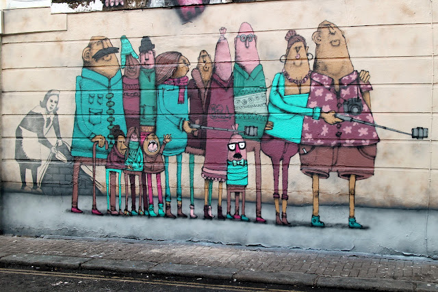 Using the popular theme of “Street Art Tours”, the French duo brought to life this pretty funny piece showing a group of tourists taking a selfie in front of a Banksy piece. Queen Elizabeth mysteriously appear to try and photo bomb the shot.