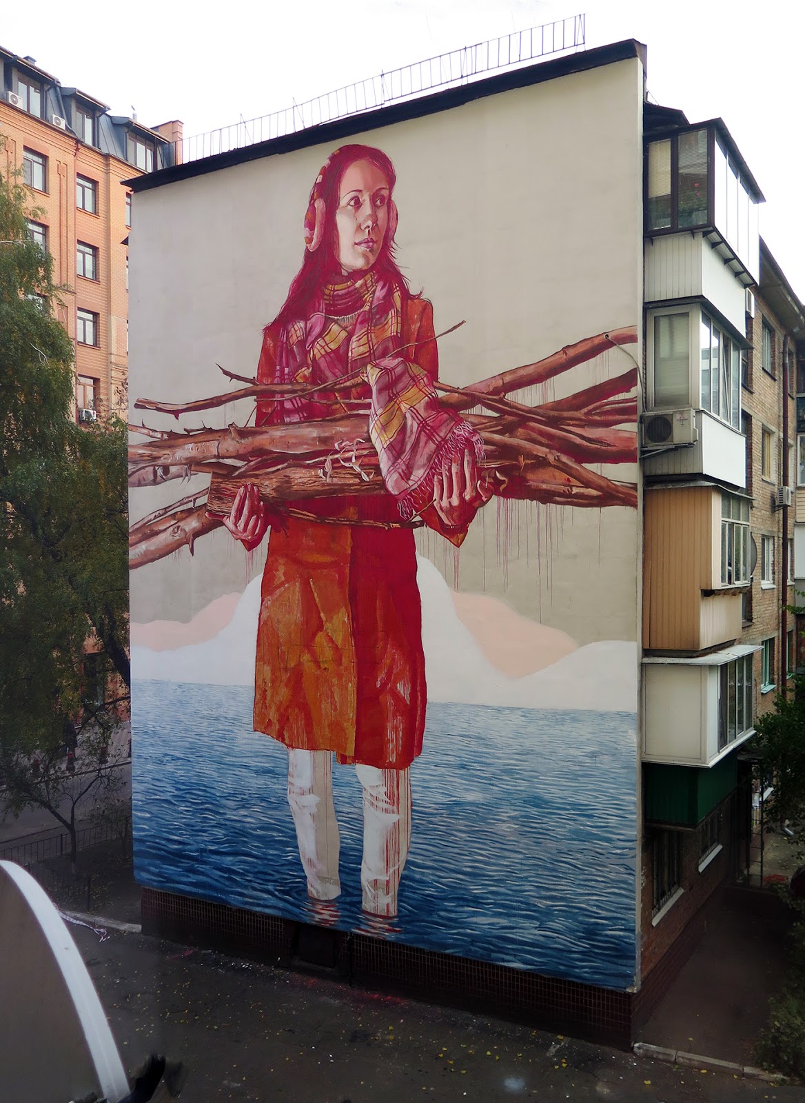 Entitled “The Rebuild”, the talented Australian street artist unveils a beautiful scene showing a young woman holding a bunch of branches in her arms. Marking the beginning of a rebuild, the scene seems to happen just after a large flooding, a recurring scene in Fintan’s work.