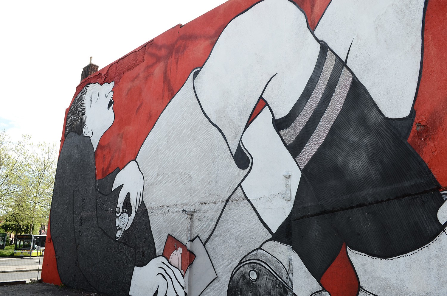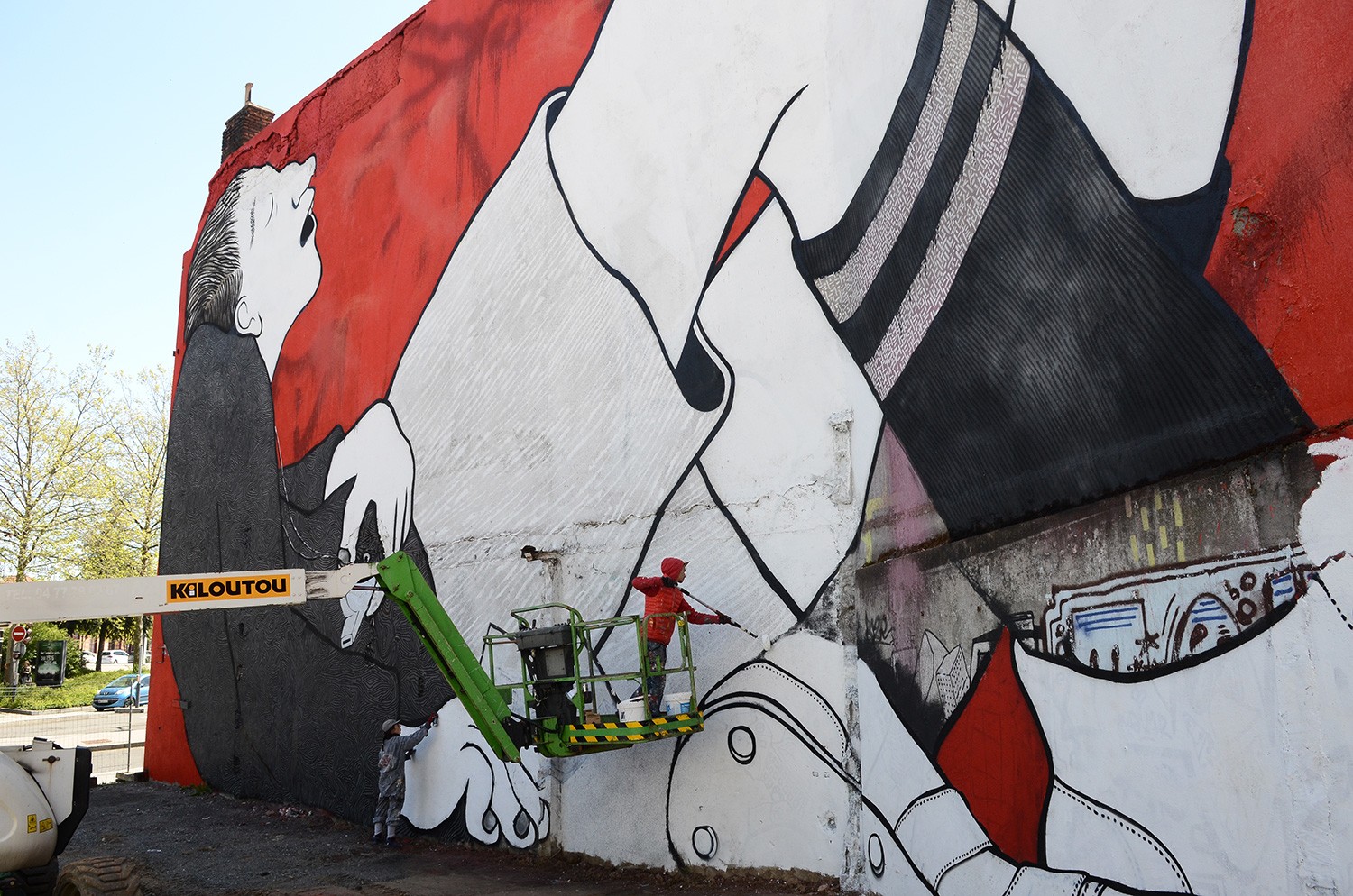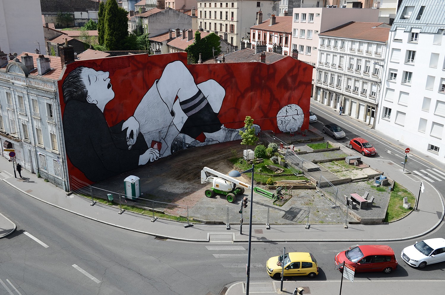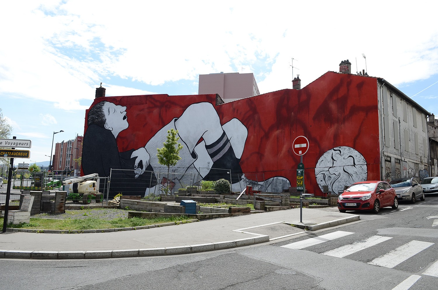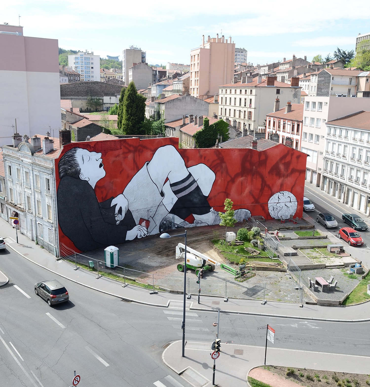 Four days of work were needed to create the referee and the sleeping moon on the 30 meters long facade. The work includes many references: the referee, taking up most of the wall, symbolizes the place of soccer in the city, a sport that has marked the history of the area. The moon is reminiscent of the Journey to the Moon by Georges Méliès, an allegory of culture and art. This poetic encounter brings us back to our dreams and imagination.
