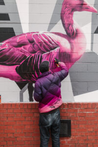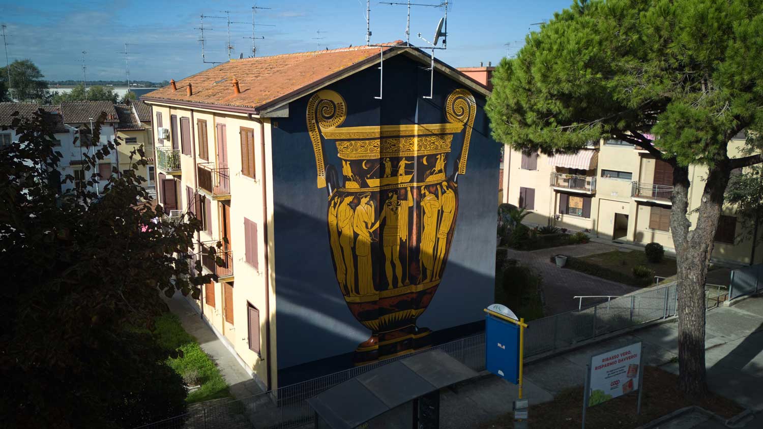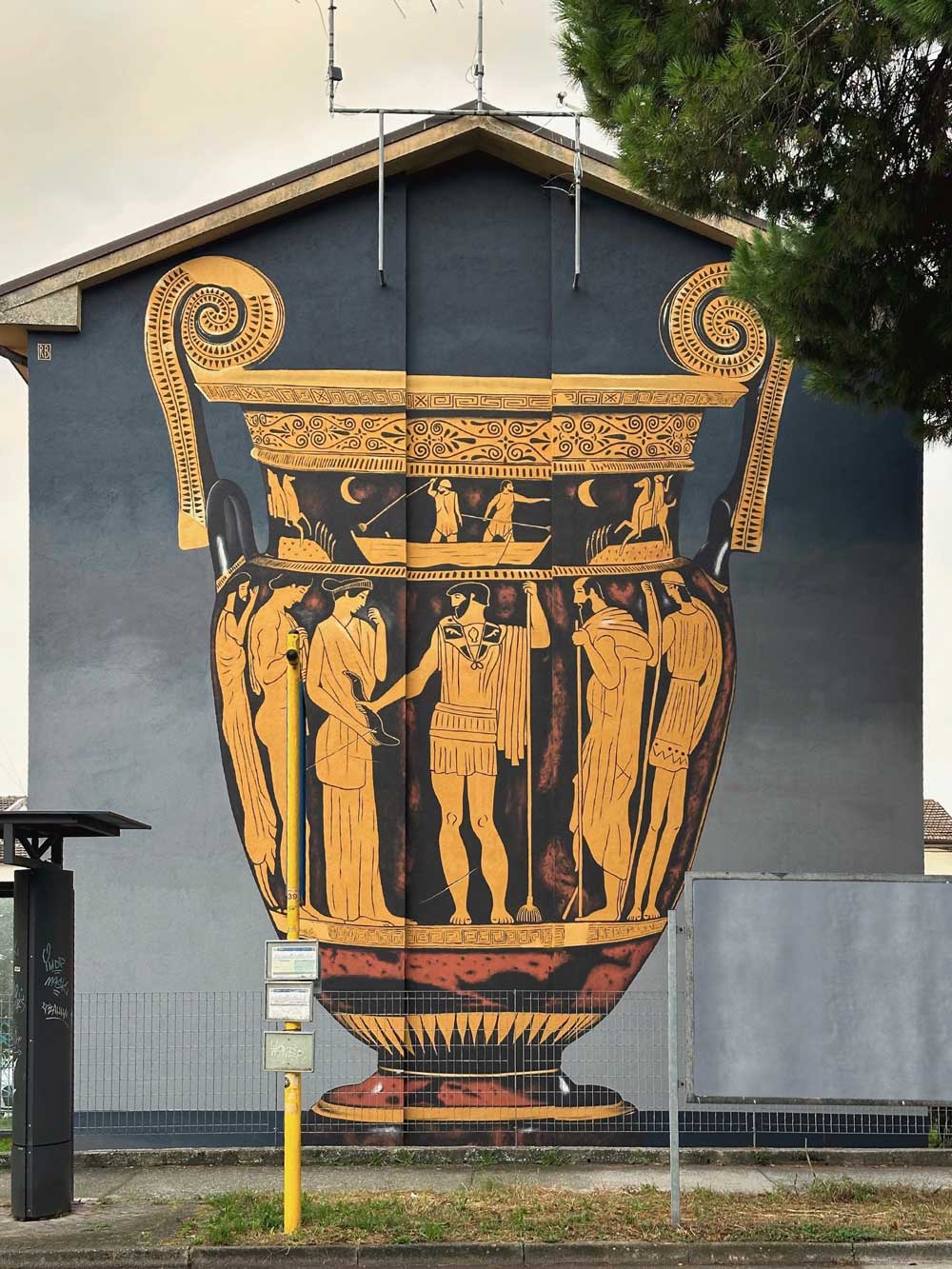 On the walls of Via Spina in Comacchio, myth meets memory in a striking new mural that reimagines one of the city’s ancient treasures, a red-figure krater from the Museo del Delta Antico depicting Hector and Andromache’s farewell in Homer’s Iliad. Here, the classical scene is pulled into the present, transforming a moment of myth into a meditation on love, duty, and endurance. The artist bridges centuries, fusing the language of ancient pottery with the visual pulse of contemporary street art.