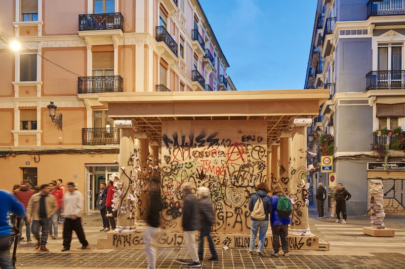 Per ofrenar earned First Prize in the Sustainable Fallas category and Third Prize in the Experimental Fallas category, celebrating both its ecological approach and conceptual strength. Over four days of festivities, hundreds of visitors actively participated by presenting their own offerings made from the same paper as the monument, including floral tributes and handwritten messages. In the final days, visitors began inscribing wishes and reflections directly onto the temple walls, transforming the installation into a living, evolving surface reminiscent of street graffiti.