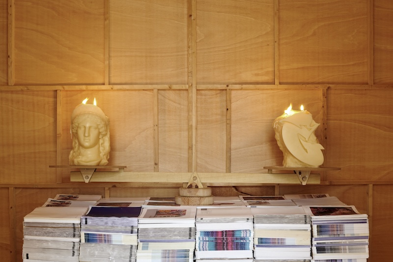 Nike in Athens, reflecting the duo’s signature fusion of classical imagery and graffiti. Inside, an altar made from surplus paper left over from the printing of PichiAvo’s 2024 book Our Odyssey held a perfectly balanced scale with two sculptural wax candles created in collaboration with Barcelona-based centenarian brand Cerabella. One candle symbolized Classical Art and the other Graffiti, expressing the duality at the core of the artists’ practice and the idea of equilibrium between creative opposites.